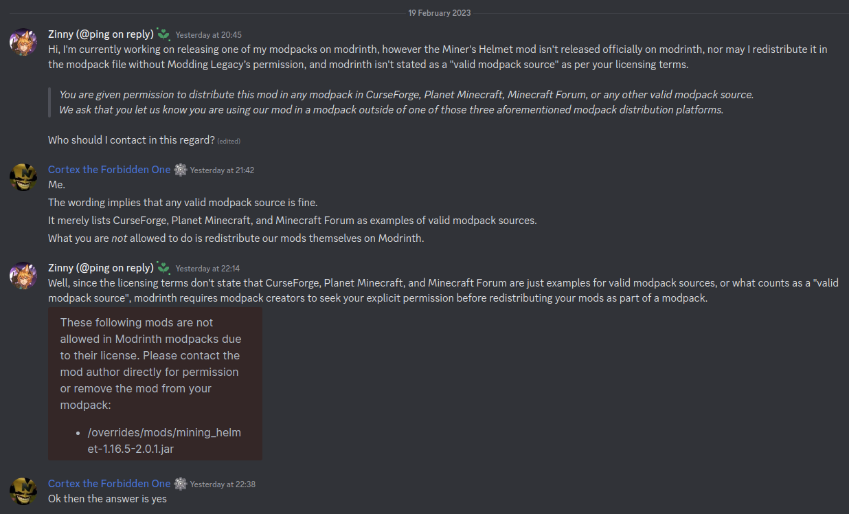 Furthermore, we have been explicitly granted permission to redistribute ModdingLegacy's Miner's Helmet as part of our modpack: